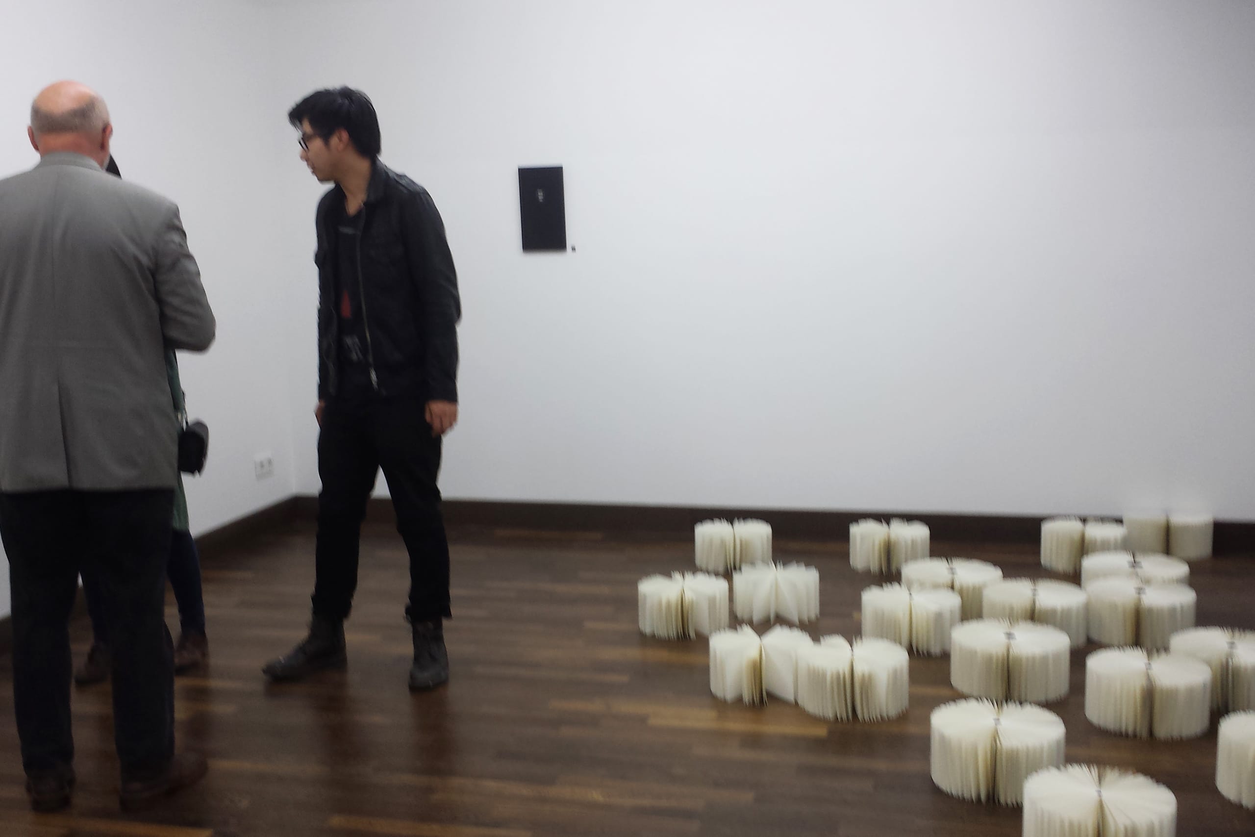 In Tangencies, the minimal materiality of paper becomes a poetic exploration of structure, surface, and space. Circular paper blocks are meticulously arranged on the floor, their layered folds radiating outward from a central black core. This dynamic interplay of geometry and rhythm transforms the squared paper format into something more organic, as the fan-like structures appear to reach out and connect with one another.